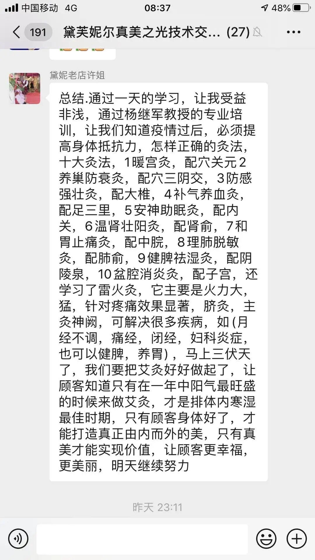 4下午,河北中医学院博士生导师杨继军教授为大家培训了夏季养生系统课程,着重培训了在真美之光传统灸法基础上创新开发出的,效果显著、方便易操作的脐灸和艾灸新疗法。